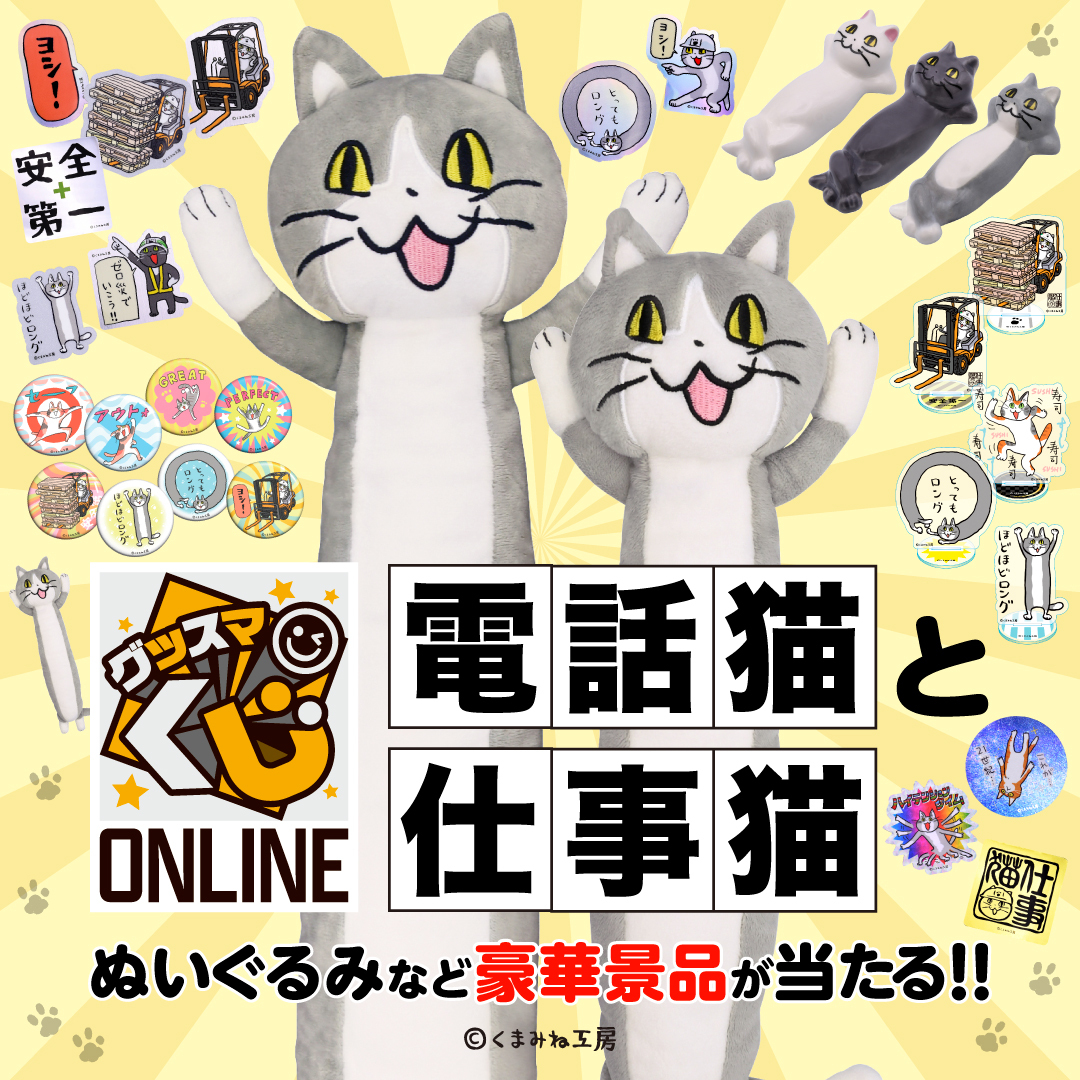 グッスマくじオンラインに『電話猫と仕事猫』が登場です。 ロングなぬいぐるみや箸置き、このくじのための描き下ろしも必見! 10連でA賞のいずれかが確定で当たります。